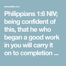 6 that he who hath begun or rather who began a good work in you will also see margin finish it the ground of st. And i am sure of this that he who began a good work in you will bring it to completion at the day of jesus christ. Young s literal translation having been confident of this very thing that he who did begin in you a good work will perform it till a day of jesus christ philippians 1 6 parallel. Being confident of this that he who began a good work in you will carry it on to completion until the day of christ jesus.